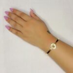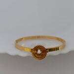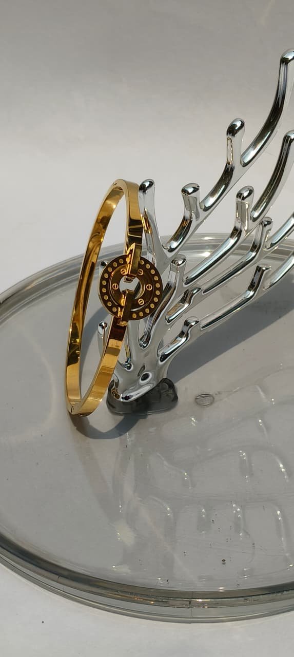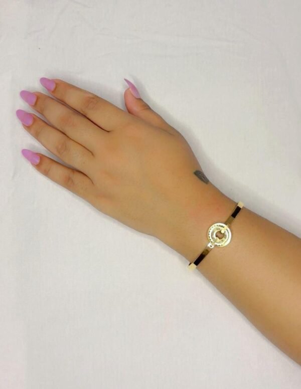 Add a modern edge to your jewellery collection with this exquisite gold-plated bracelet. The sleek band is accentuated by a distinctive circular charm detail, symbolizing balance and timeless elegance. Its polished finish and minimalist design make it a versatile accessory that complements both casual outfits and formal ensembles.