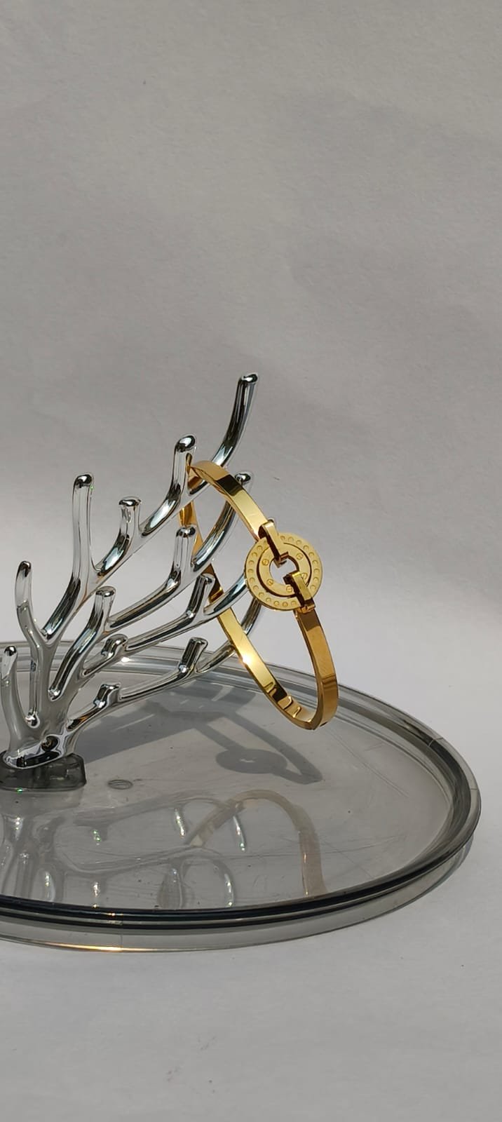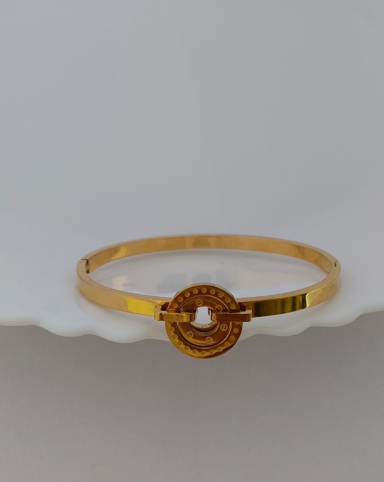 Add a modern edge to your jewellery collection with this exquisite gold-plated bracelet. The sleek band is accentuated by a distinctive circular charm detail, symbolizing balance and timeless elegance. Its polished finish and minimalist design make it a versatile accessory that complements both casual outfits and formal ensembles.
