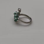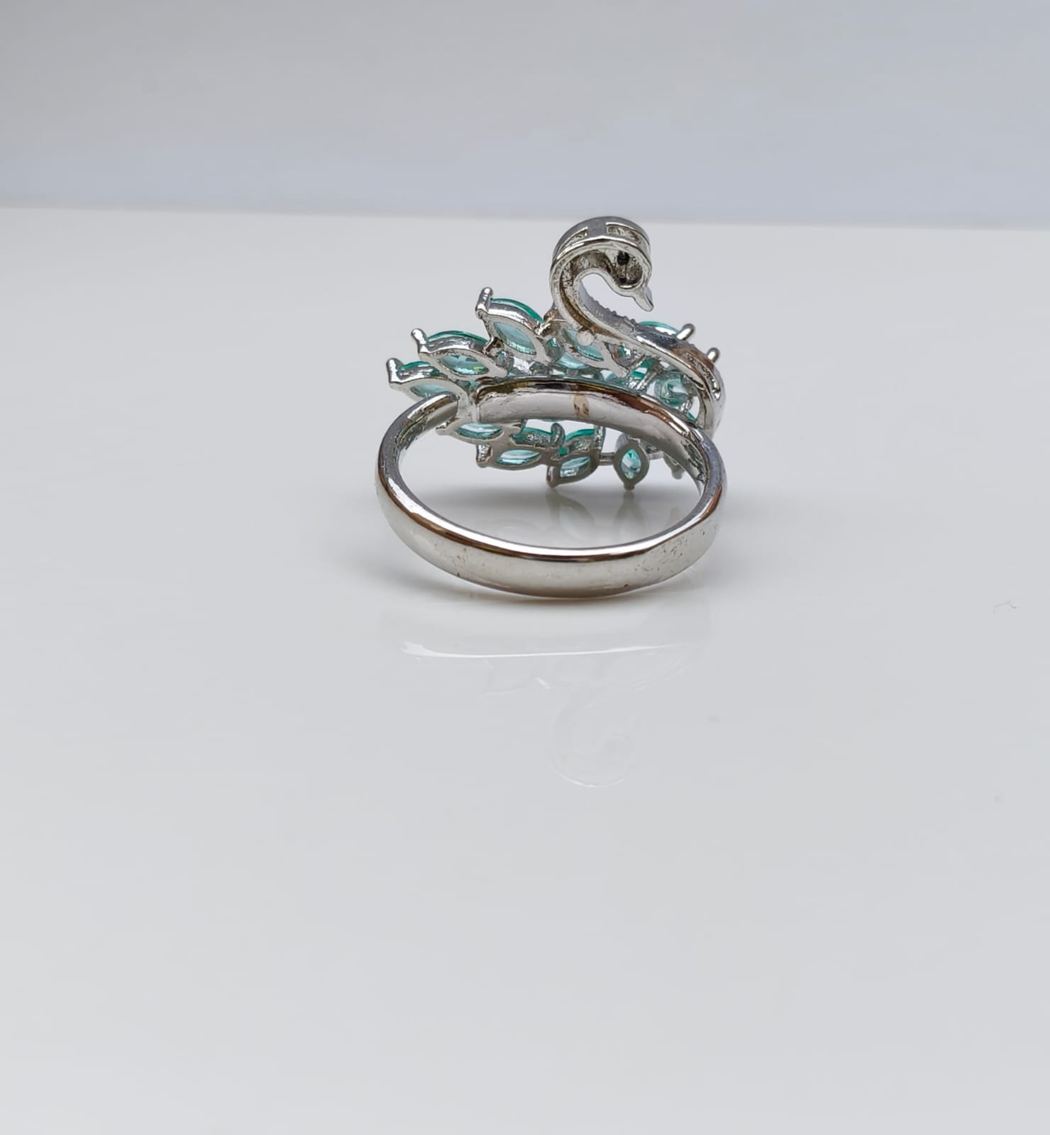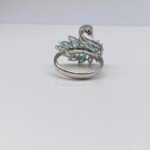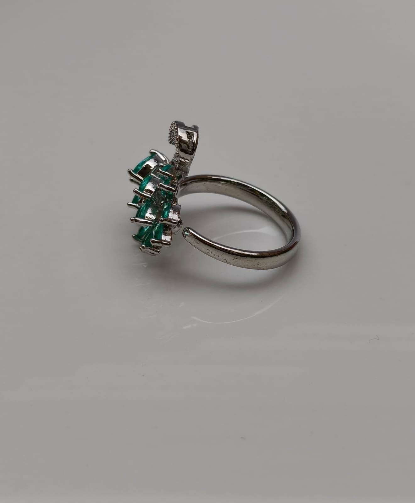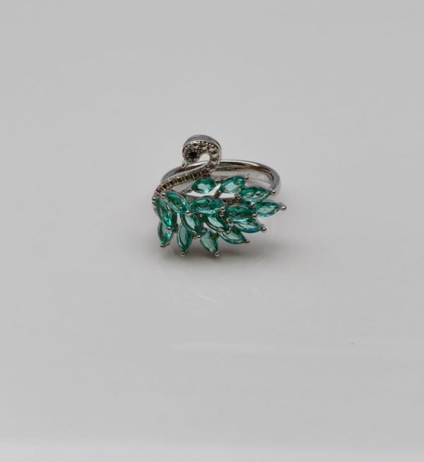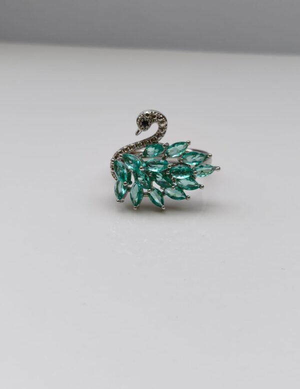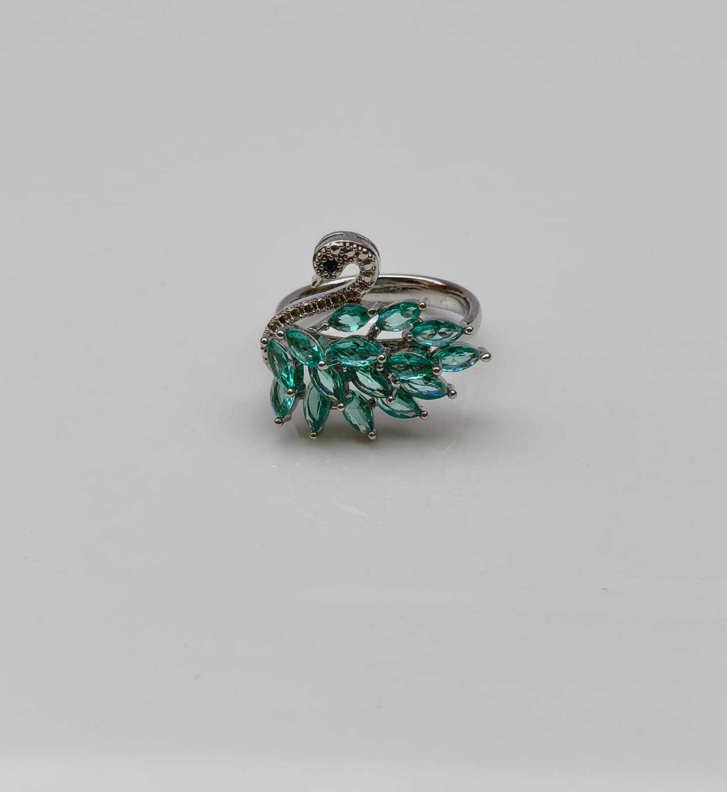 The Emerald Grace Swan Ring captures the timeless charm of a swan, representing love, loyalty, and elegance. Crafted with precision, its body is adorned with shimmering silver accents, while the wings are decorated with multiple marquise-cut emerald green stones that radiate brilliance with every movement. This artistic blend of luxury and nature-inspired design makes it a captivating statement piece, perfect to elevate both ethnic and contemporary looks.