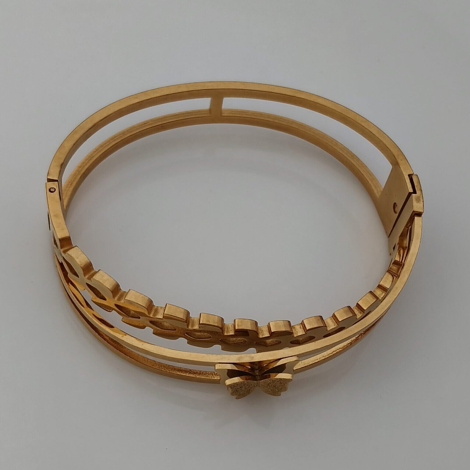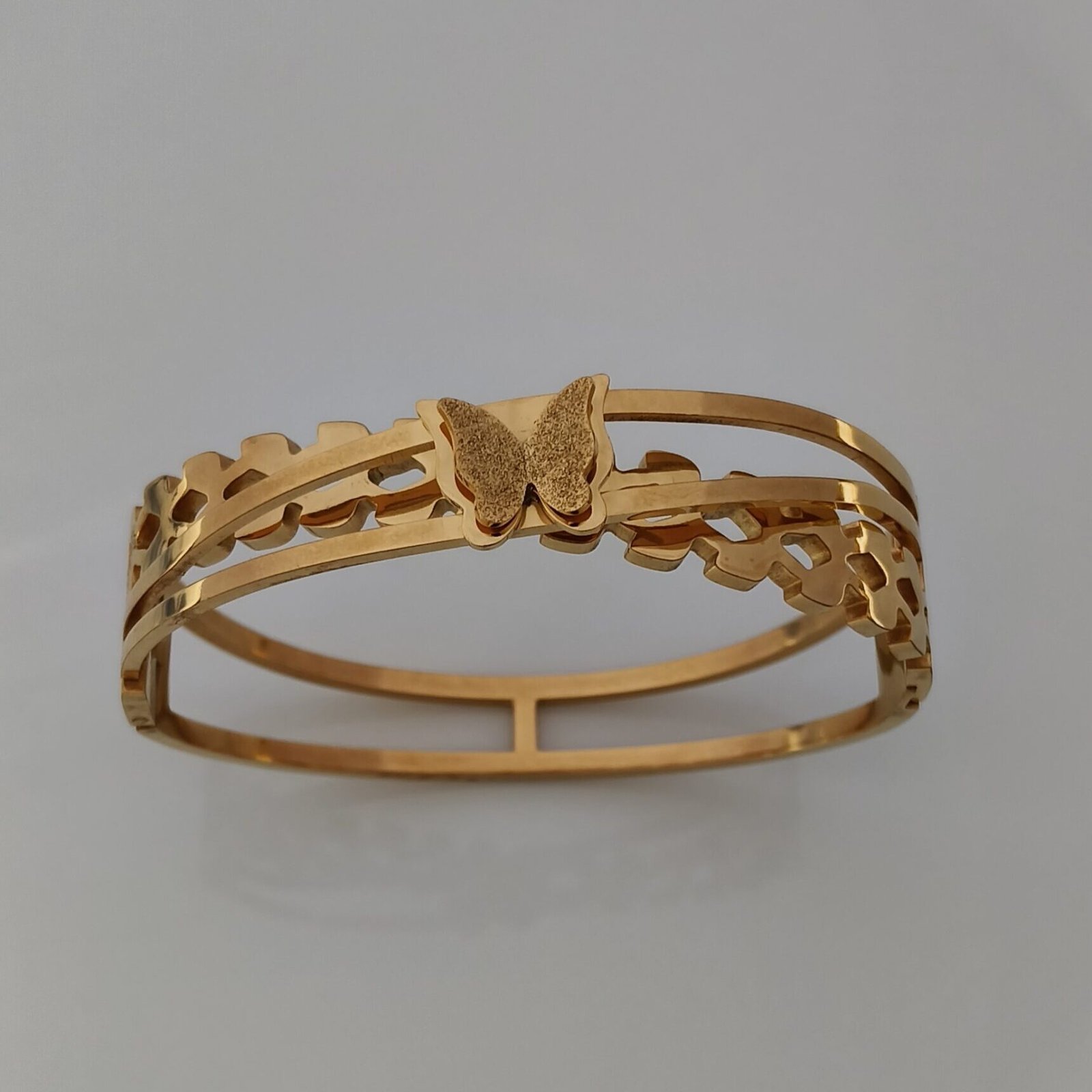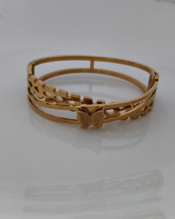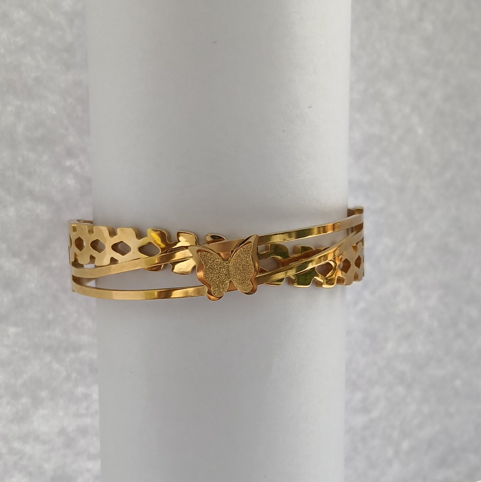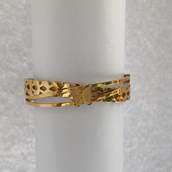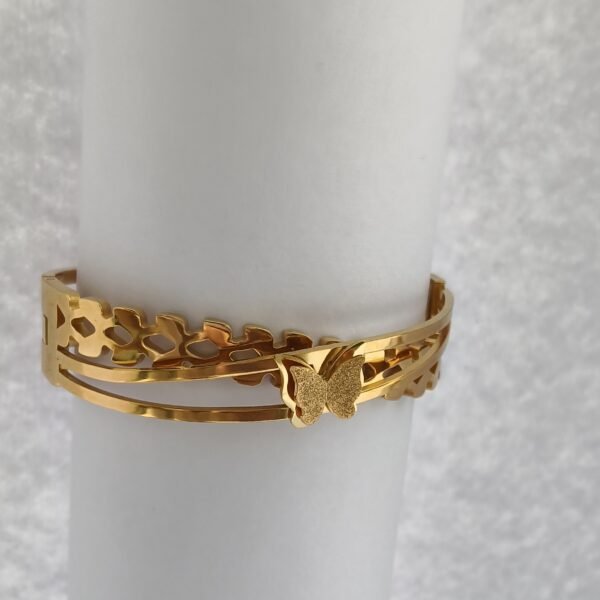 “A beautifully crafted gold-toned bangle featuring intricate cutwork and a delicate butterfly charm—perfect for adding a touch of elegance to any outfit.”