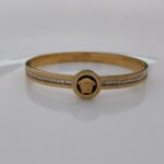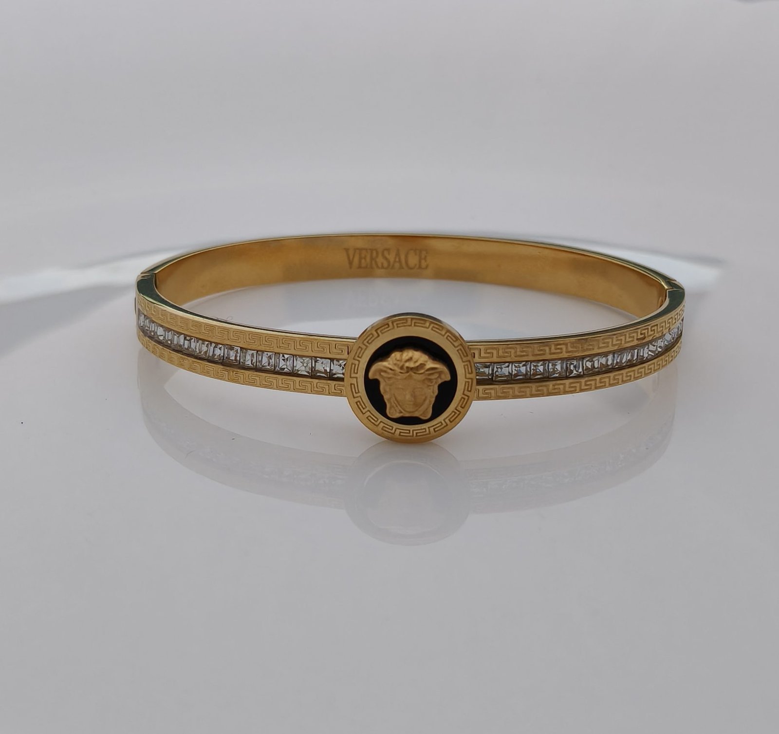This elegant gold-plated bracelet features the iconic Medusa emblem at the center, symbolizing power and luxury. Accented with shimmering stones along the band and framed with a signature Greek key design, it blends timeless sophistication with modern glamour. A true statement accessory for any occasion.