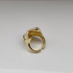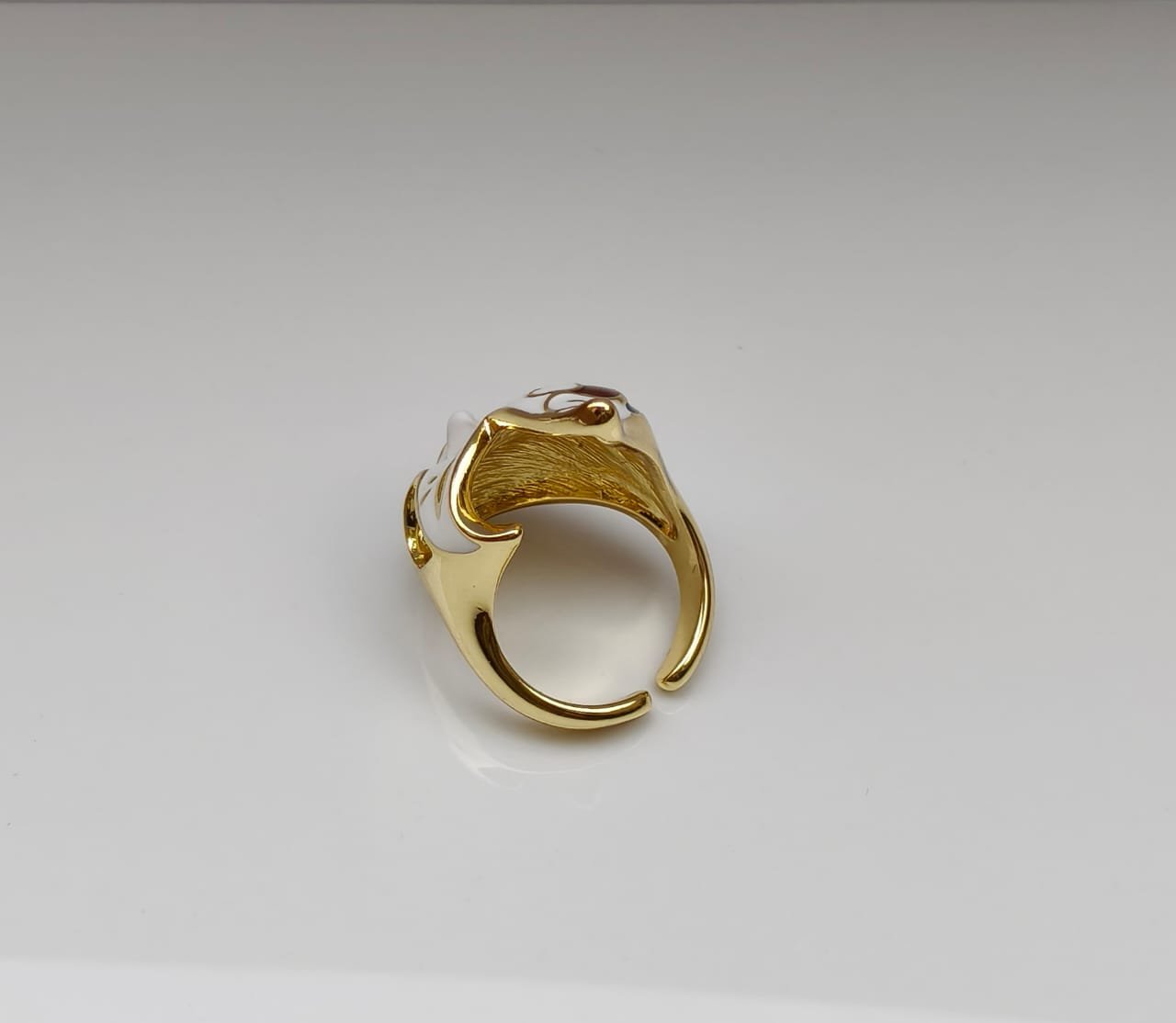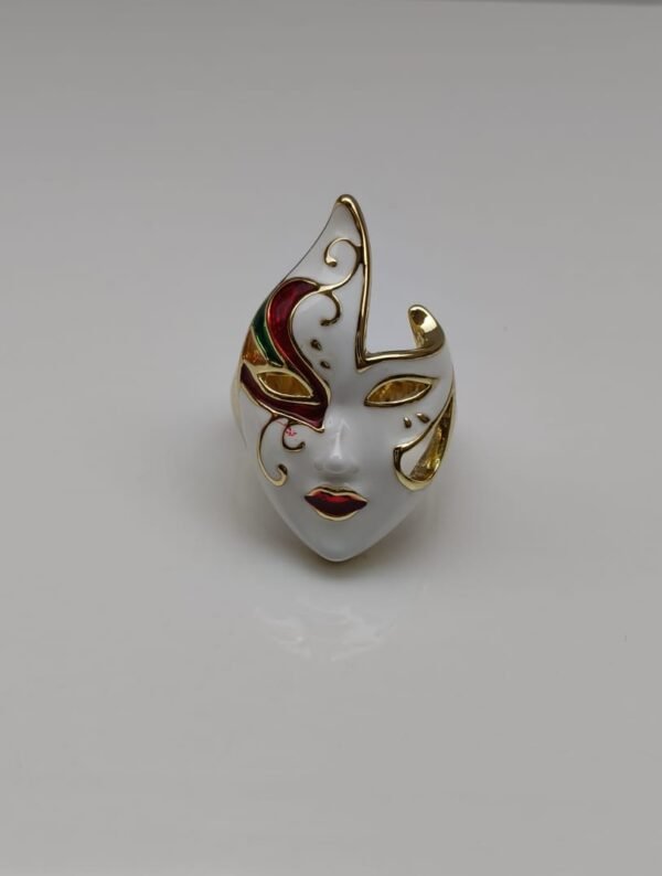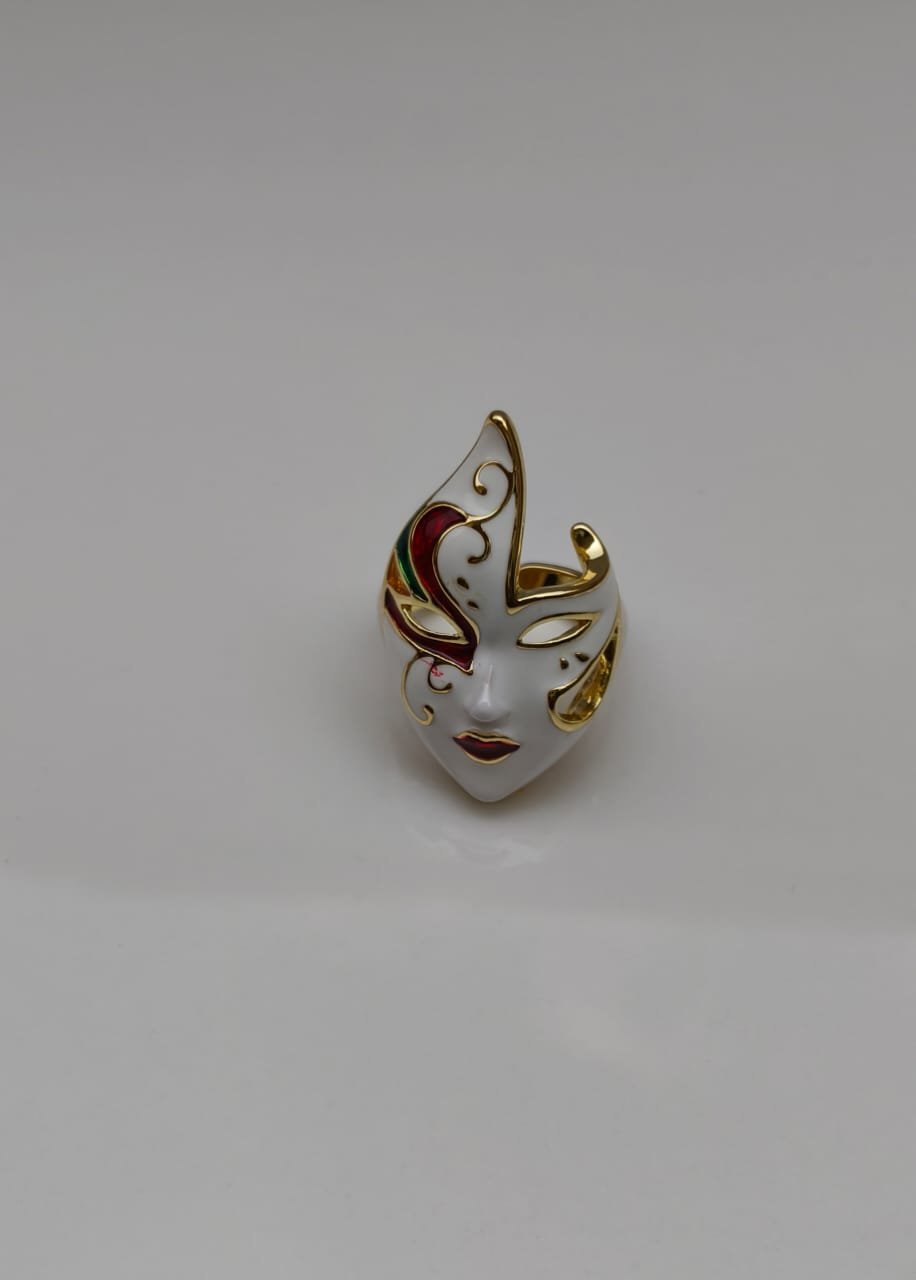 The Mystic Flame Ring is a captivating statement piece designed in the form of an artistic face mask with flame-like curves. Crafted with smooth white enamel and enriched with red, green, and golden detailing, it radiates mystery and elegance. The bold red lips and intricate gold accents symbolize passion and strength, making this ring a true emblem of individuality and style.