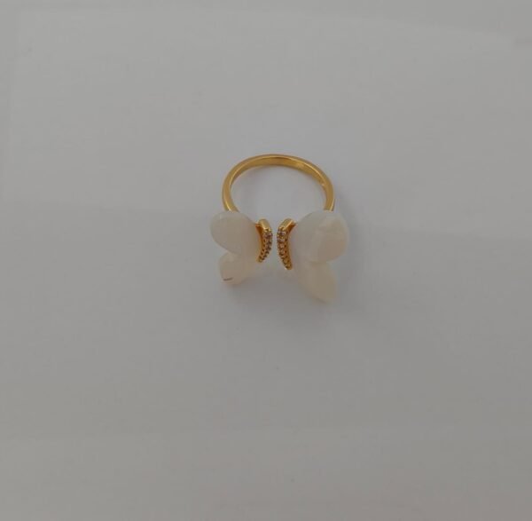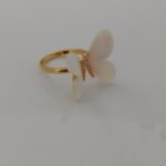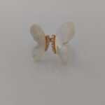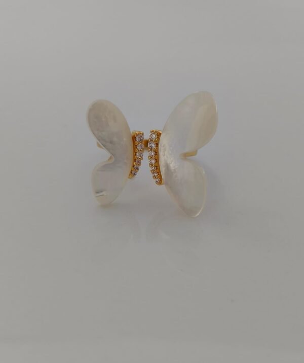This elegant butterfly ring beautifully blends charm and sophistication. Designed with lustrous mother-of-pearl wings, the butterfly motif symbolizes transformation, grace, and new beginnings. The golden base is encrusted with sparkling cubic zirconia stones, adding a touch of glamour and brilliance. Perfect for both everyday wear and special occasions, this ring is a timeless piece that enhances your feminine elegance.