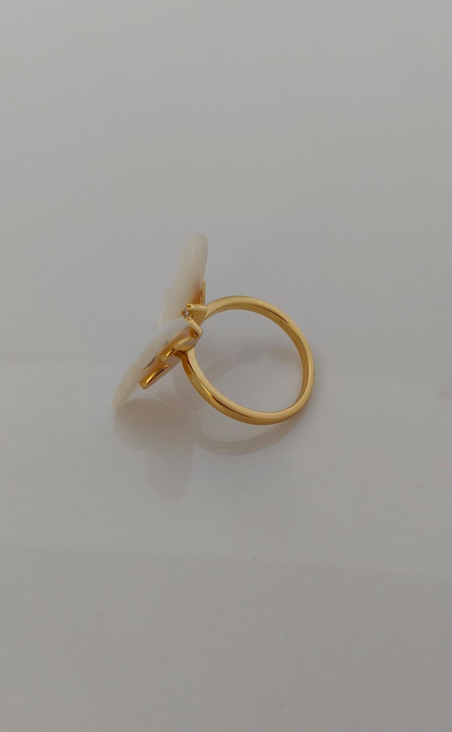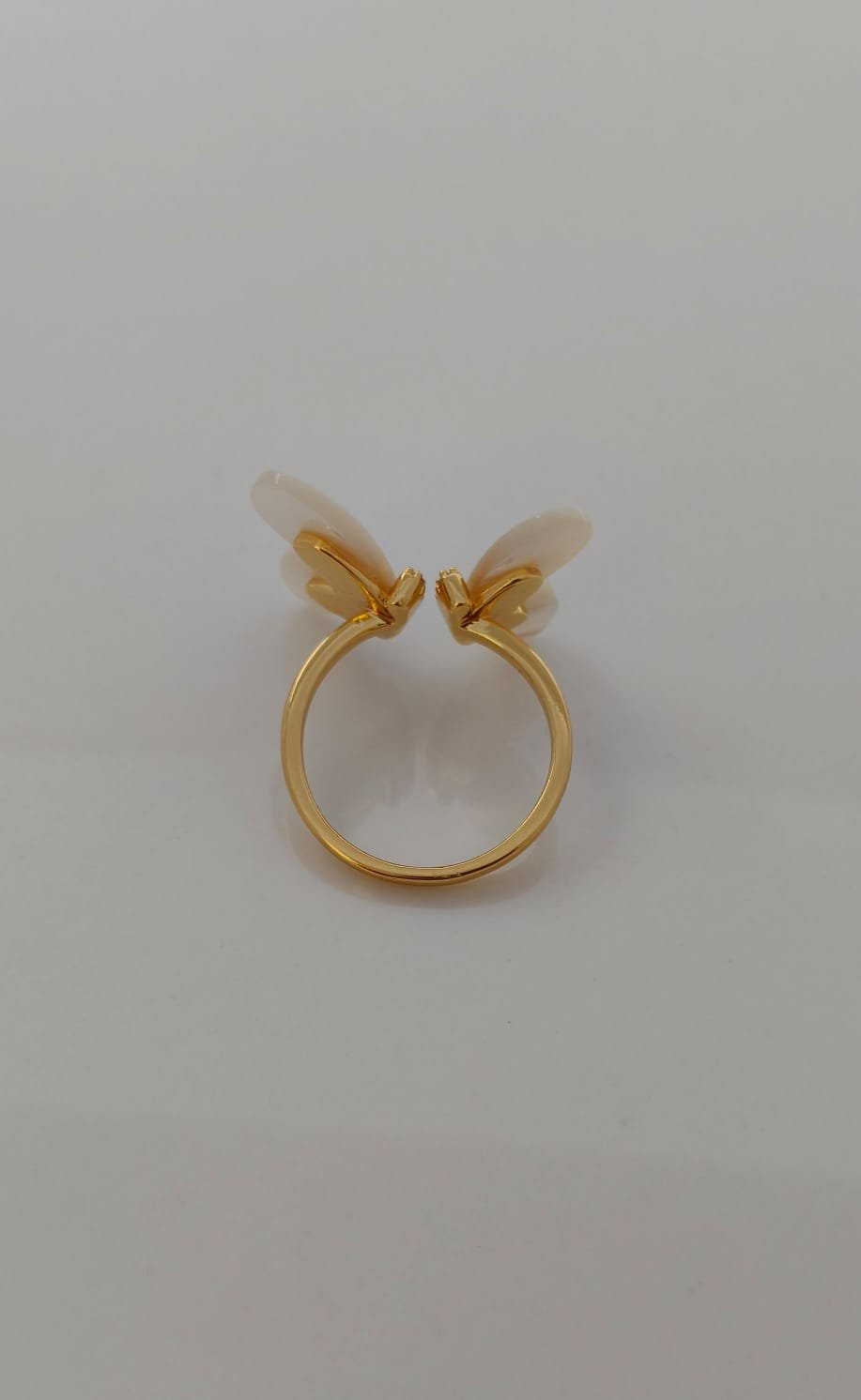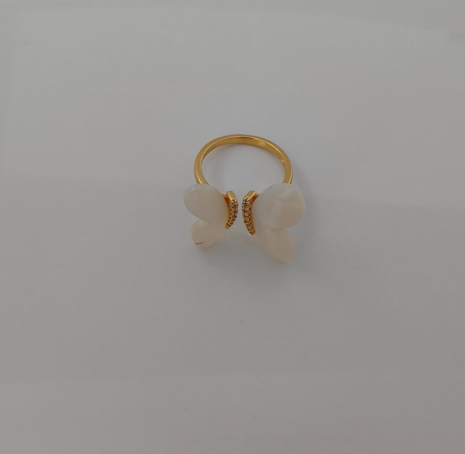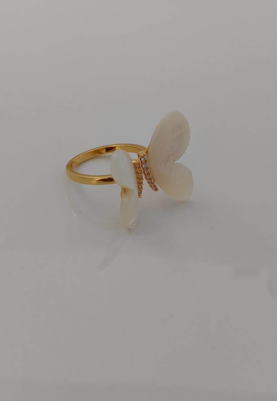 This elegant butterfly ring beautifully blends charm and sophistication. Designed with lustrous mother-of-pearl wings, the butterfly motif symbolizes transformation, grace, and new beginnings. The golden base is encrusted with sparkling cubic zirconia stones, adding a touch of glamour and brilliance. Perfect for both everyday wear and special occasions, this ring is a timeless piece that enhances your feminine elegance.