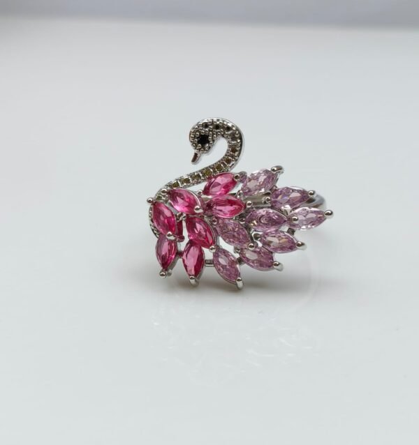 The Rose Elegance Swan Ring is a symbol of beauty, love, and grace. Designed in the shape of a swan, this ring features sparkling marquise-cut stones in shades of rose pink and soft lavender, mimicking delicate feathers. The finely detailed silver-toned body of the swan adds sophistication, making it a timeless accessory for those who adore elegance and charm. Perfect for special occasions or as a statement piece, this ring celebrates femininity with a touch of luxury.