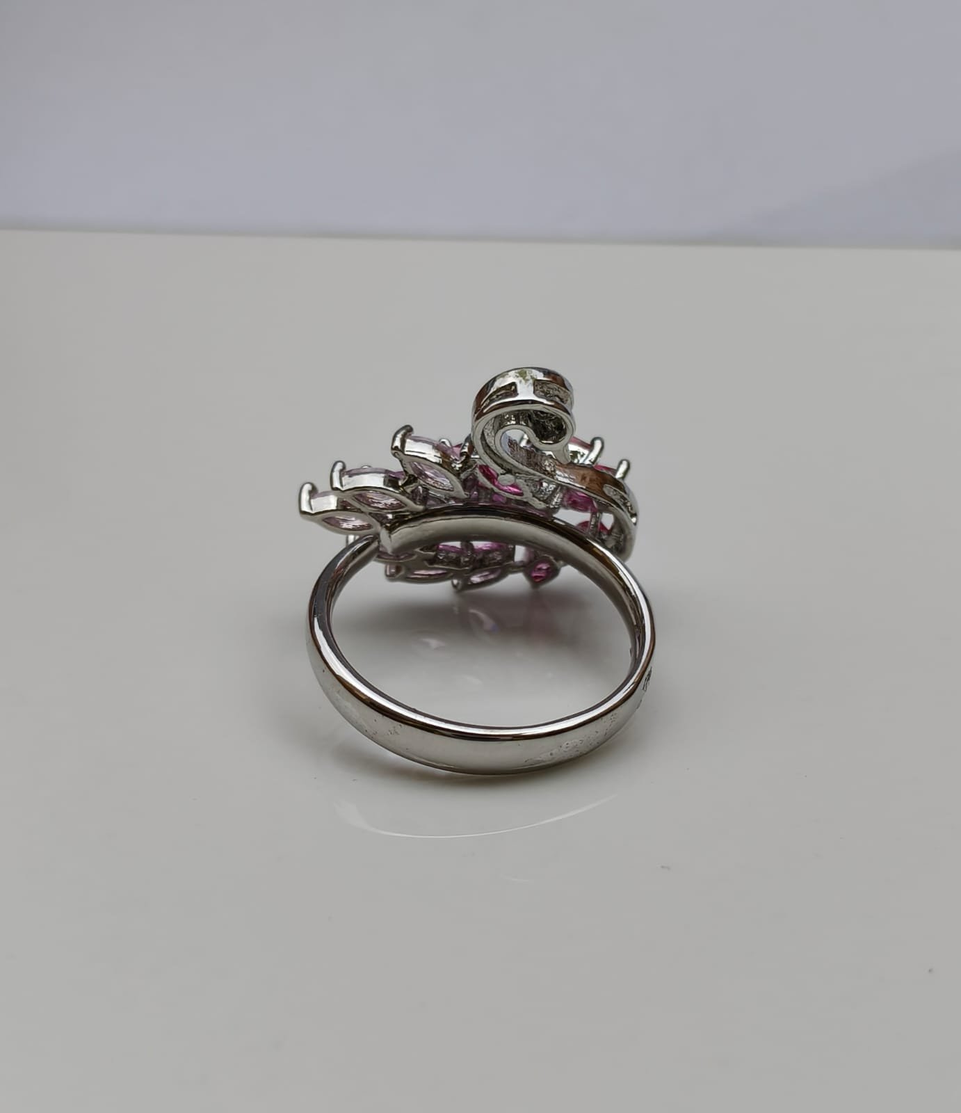 The Rose Elegance Swan Ring is a symbol of beauty, love, and grace. Designed in the shape of a swan, this ring features sparkling marquise-cut stones in shades of rose pink and soft lavender, mimicking delicate feathers. The finely detailed silver-toned body of the swan adds sophistication, making it a timeless accessory for those who adore elegance and charm. Perfect for special occasions or as a statement piece, this ring celebrates femininity with a touch of luxury.